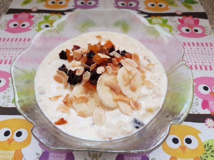 Die getrockneten Früchte in ein wenig Wasser einweichen Die abgeschälten Bananen mit dem Saft einer Zitrone, dem Orangensaft, dem Honig sowie dem Joghurt zermusen.