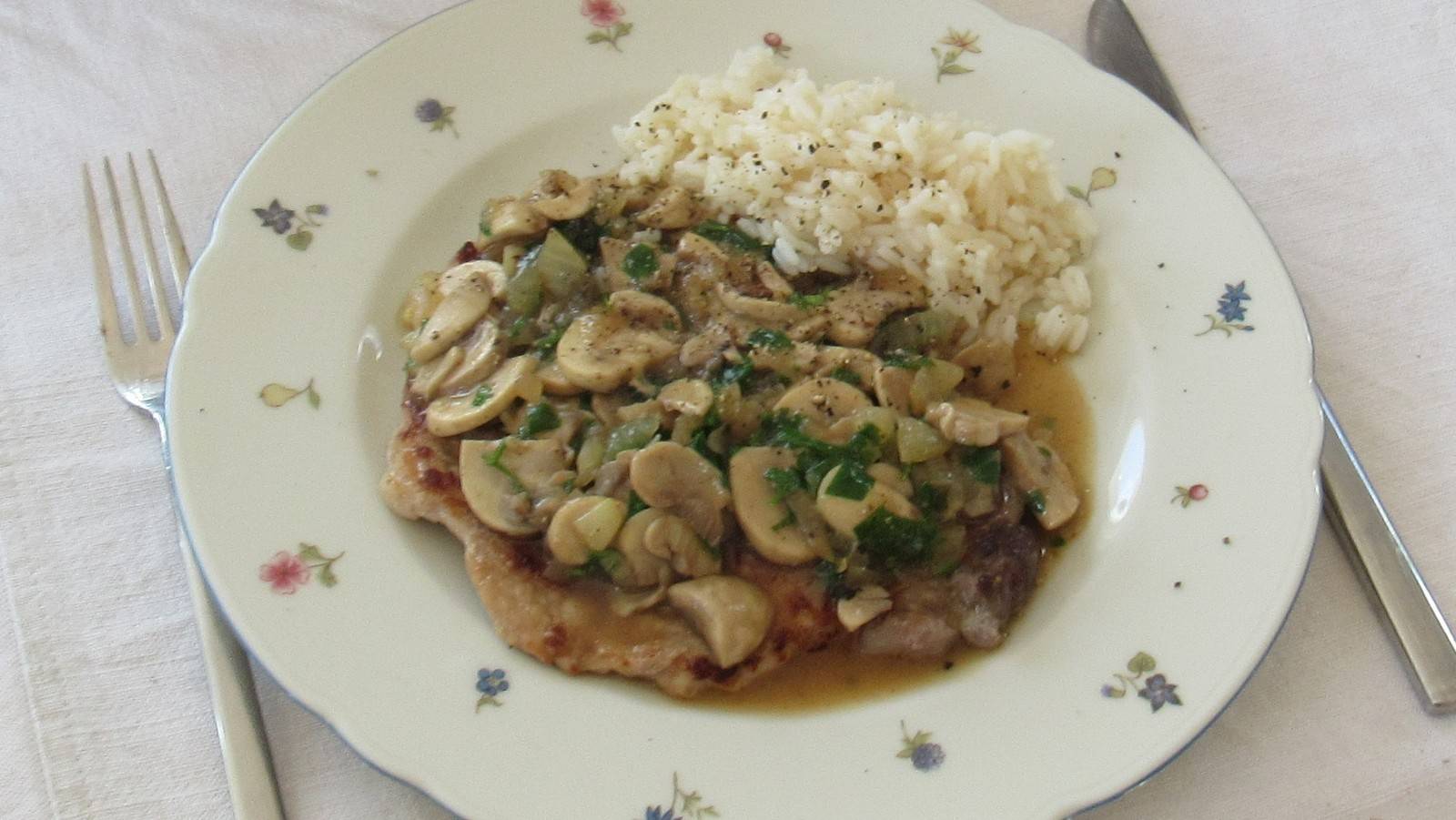 Öl in einer Pfanne erhitzen, Fleisch einlegen und beidseitig braten, wieder aus der Pfanne nehmen. Im Bratensatz die Zwiebel hell rösten, Champignons zugeben und weiterbraten, mit der Suppe aufgießen, Fleisch wieder zugeben und weich dünsten.