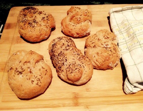 Eine Rolle formen und gleichgroße Stücke abschneiden, Gebäck nach Belieben formen. Mit Wasser bestreichen und mit Kümmel, Salz, Kürbiskernen, Mohn oder Sesam bestreuen und das Dinkelvollkorngebäck im vorgeheizten Rohr bei 200 Grad für ca. 15-20 Minuten backen.