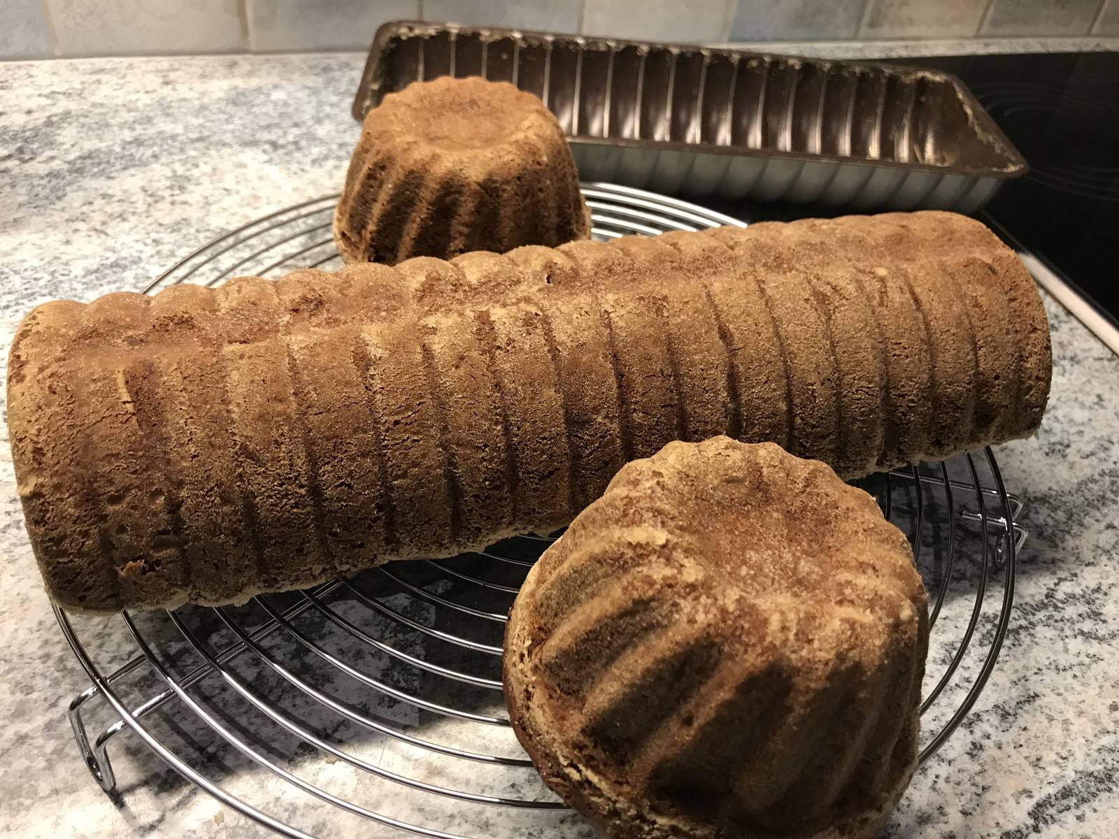 Wenn der Teig zu fest ist, etwas Milch oder Wasser beigeben. In eine gut gefettete, mit Mehl ausgestaubte Rehrückenform füllen und im vorgeheizten Backrohr bei ca. 160 °C etwa 70 Minuten backen.