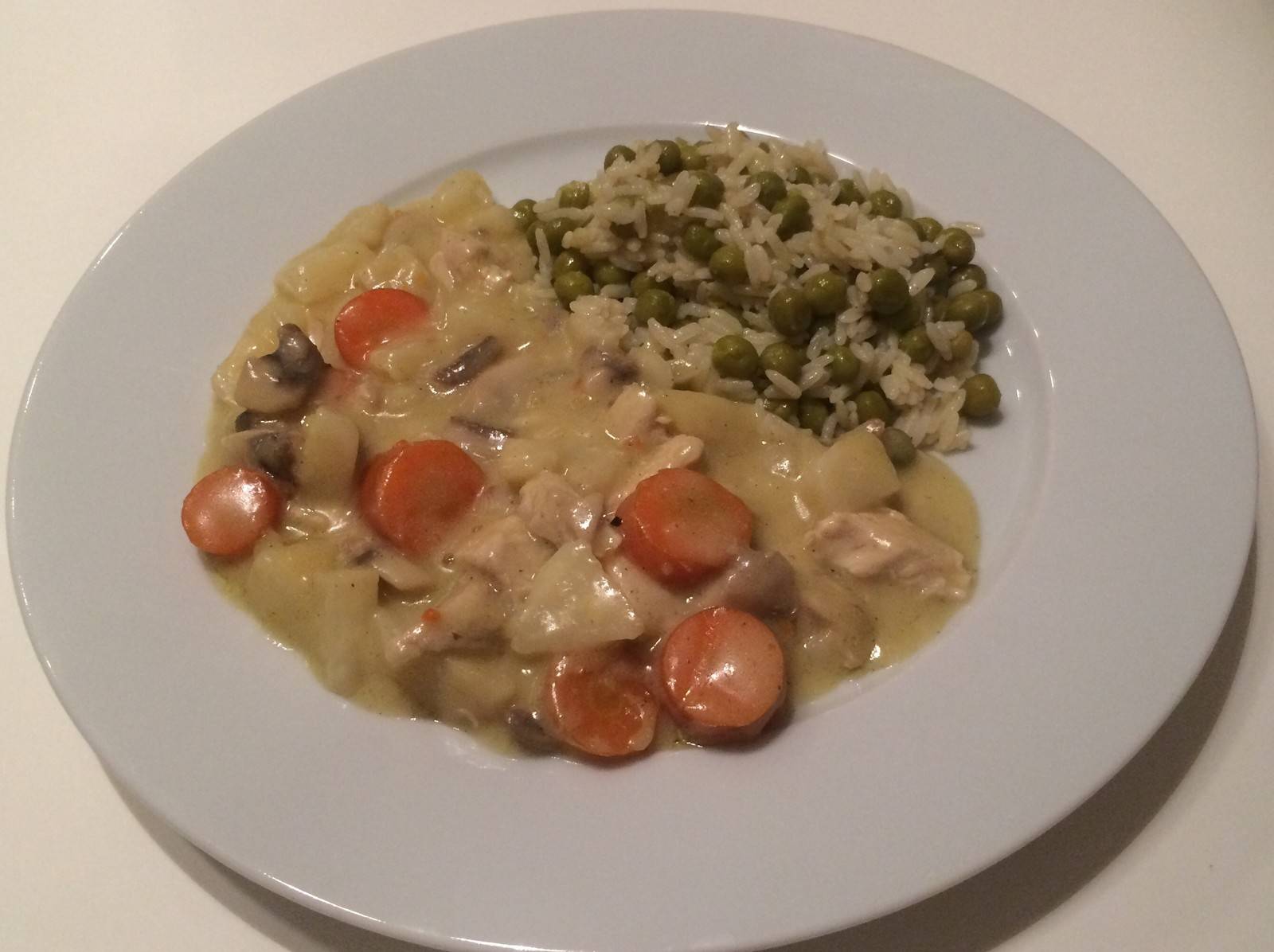 Als Beilage zum Hühnerragout werden in Speck gebratene Grießnockerl, Krautsalat oder Risipisi empfohlen.