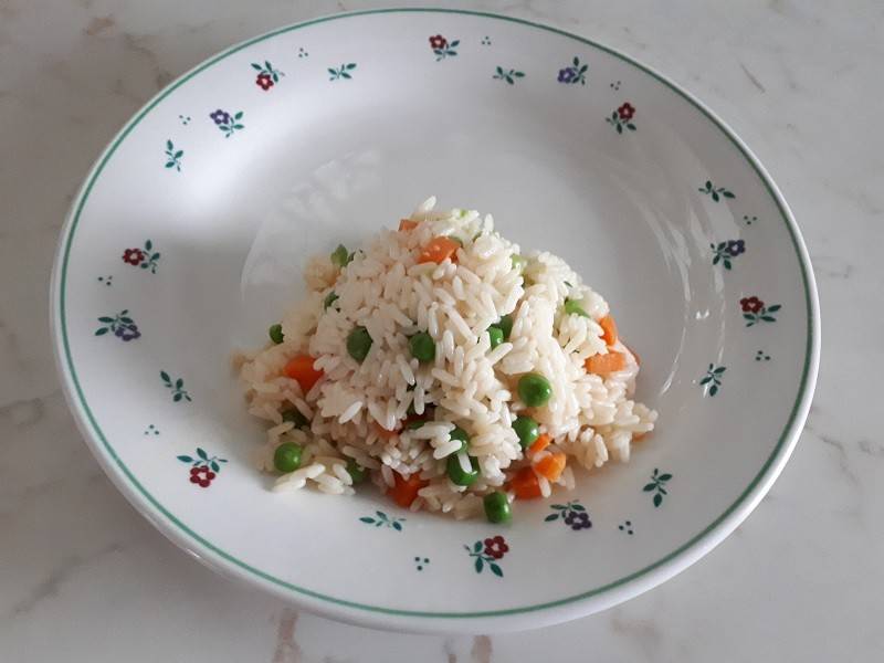 Karotten putzen und in kleine Würfel schneiden. Karotten und 2 Esslöffel Wasser in einem kleinen Topf garen, bis das Wasser verdampft ist, Erbsen, Salz und Butter zugeben und 1 Minute garen lassen. Gemüse mit dem Reis vermengen.