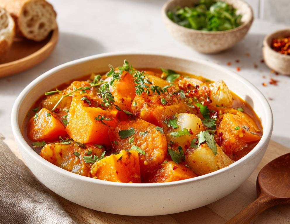 Das Kürbisgulasch mit Pfeffer und Crème fraîche und einem Schuss Kürbiskernöl anrichten und heiß servieren.