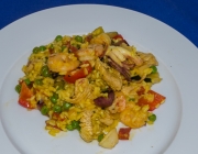Für die Paella zunächst Gambas, Frutti di Mare, Muscheln und Erbsen entfrosten.Bohnen abspülen, reinigen, in mundgerechte Stückchen schneiden. In Salzwasser...