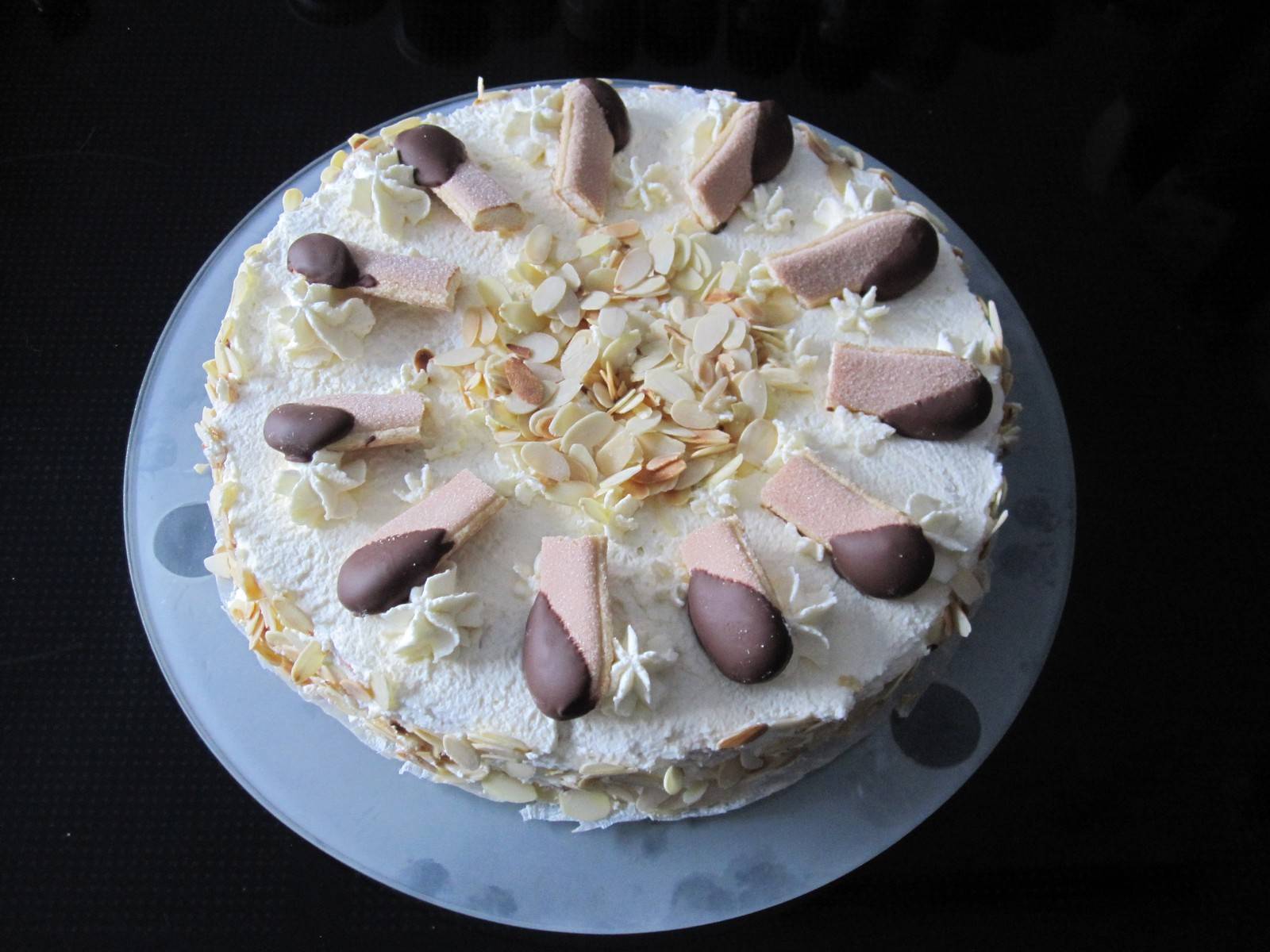 Ich bereite von der Creme immer mehr zu und streiche sie dann mit Creme ein anstelle von Schlagobers und reiche Schlagobers einfach dazu.So kann man die Torte schon einen Tag vorher fertigstellen. Beim Schlagobers sollte man das erst kurz vor dem servieren machen´, denn Schlagobers nimmt im Kühlschrank einen eigenartigen Geschmack an.