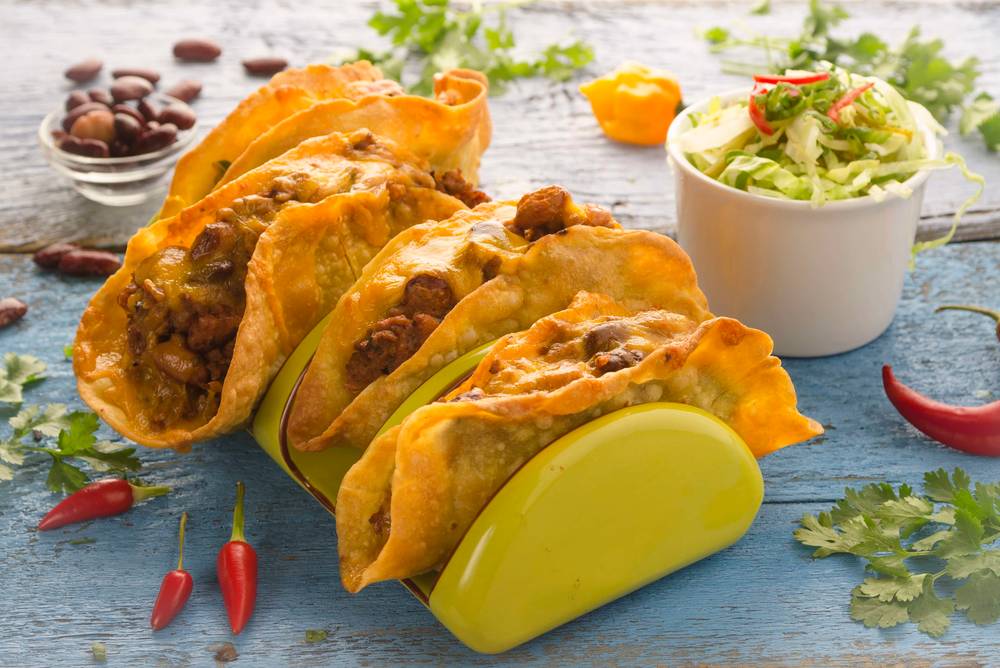 Für Tacos werden die Tortillas mit Fleischstückchen belegt. Frittiert, knusprig braun, mit Koriander bestreut und eingerollt ein schneller Snack auf die Hand. Zu den Tacos werden Salsas serviert; eine pikante Sauce aus Paradeisern, Chili, Zwiebeln, Knoblauch, Koriander und Limonensaft.