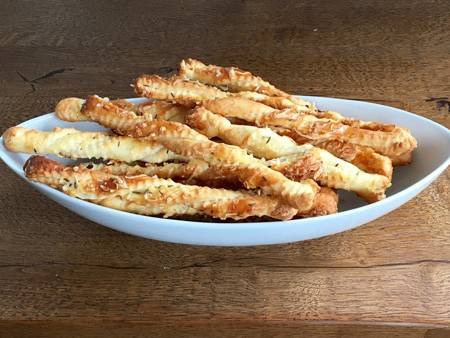 Mit dem Teigroller über den Käse rollen. Teig der Länge nach halbieren und aus jeder Hälfte ca. 20 Streifen schneiden. Gegengleich eindrehen und die pikanten Käsestangerl bei 200 °C ca. 10 Minuten backen.