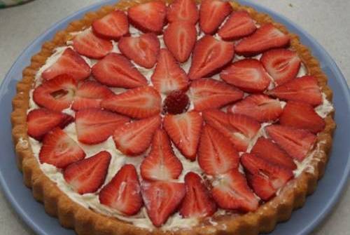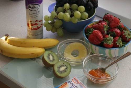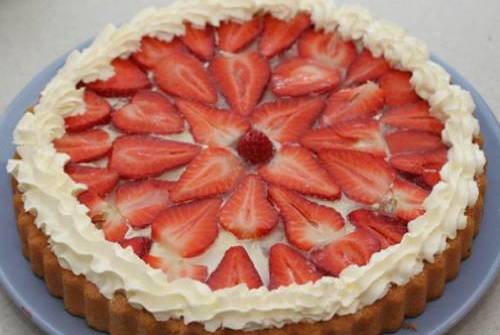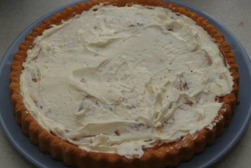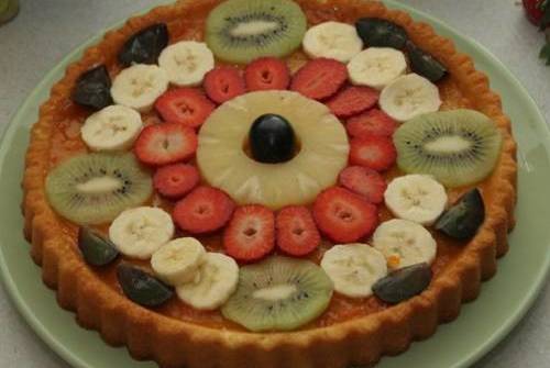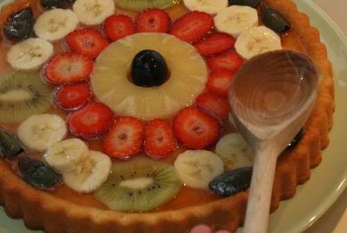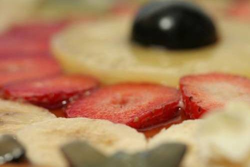 Eine alternative Variante wäre, den Boden mit Schlagobers zu bestreichen und darauf das Obst zu legen.