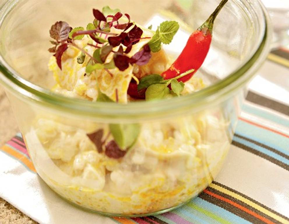 - Die Hähnchenbrust abkühlen lassen, dann in kleine Würfel schneiden. Mit den Perlgraupen in eine Schüssel geben.