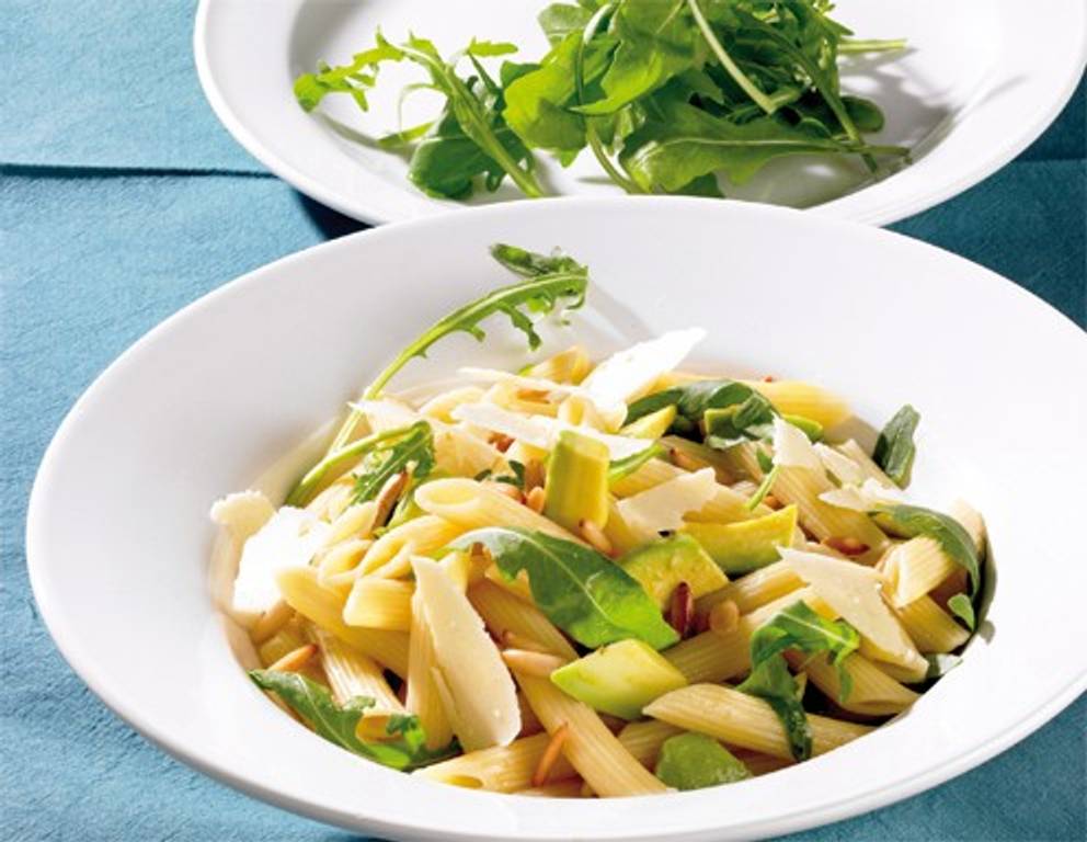 - Nudeln abgießen, kurz abtropfen lassen und im Knoblauchöl schwenken. Avocadowürfel und Rucola unterheben. Mit Salz, Pfeffer und Zitronensaft abschmecken.