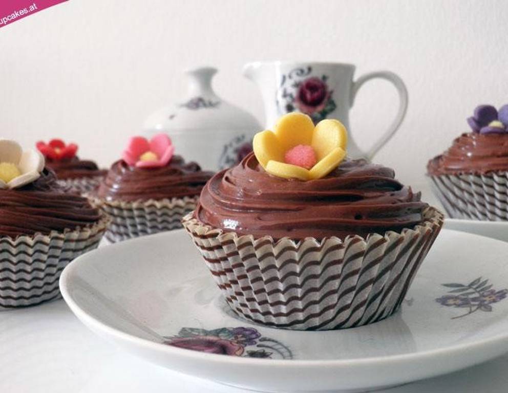 - Den Schlagobers erhitzen (nicht kochen!) und über die fein gehackte Schokolade gießen. Etwa fünf Minuten warten bis die Schokolade geschmolzen ist und vorsichtig mit einer Gabel sorgfältig vermengen. Dann etwa 20-30 Minuten von innen nach außen schlagen bis sie fest ist. Vorübergehend in den Kühlschrank stellen, vor Gebrauch kurz durchrühren und mit einem Spritzbeutel auf den ausgekühlten Cupcakes verteilen. Nach Belieben dekorieren.