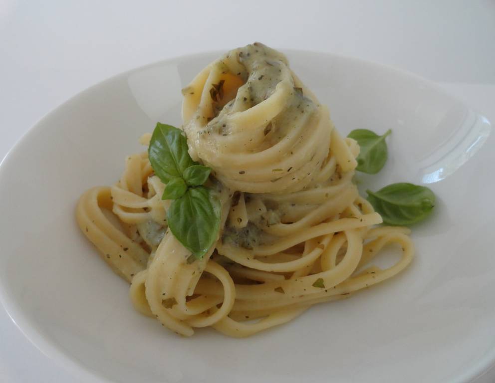 Die Nudeln mit Zucchinisauce evt. mit gerösteten Speckwürfeln oder Pinienkernen bestreuen.