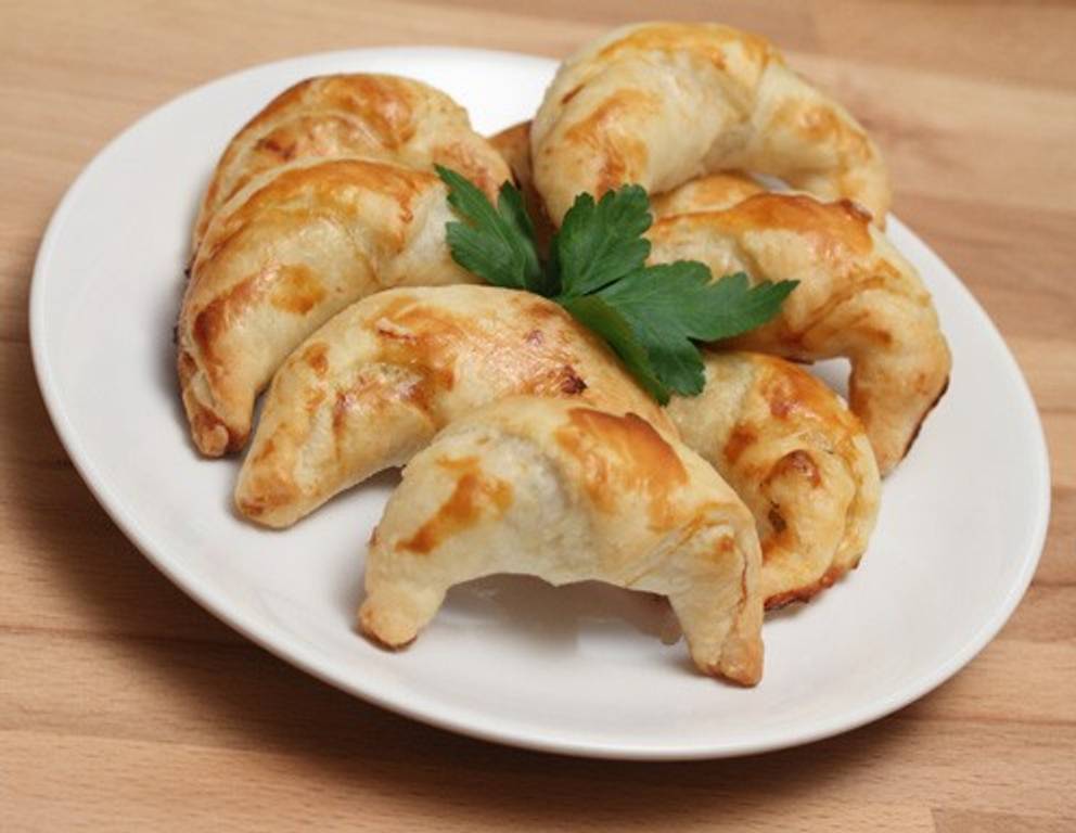 Die Schinkenkipferln kann man auch mit gehackter Zwiebel ergänzt zubereiten.