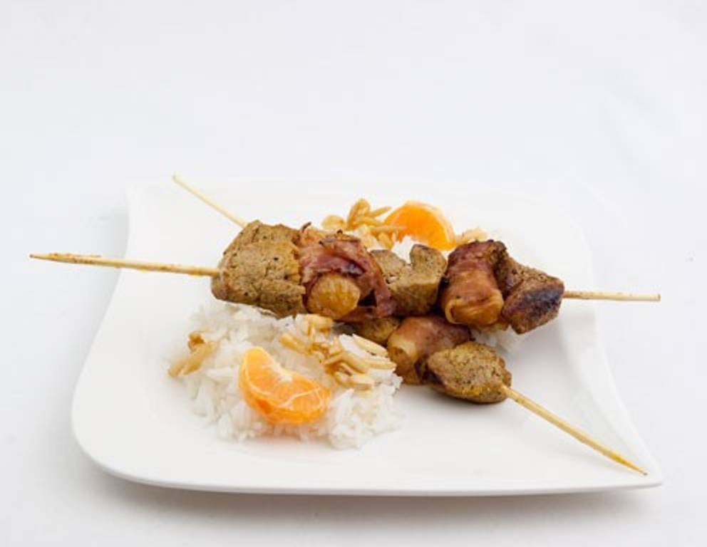 Zu den Mandarinen-Schweinefleisch-Spießchen passt Reis besonders gut.