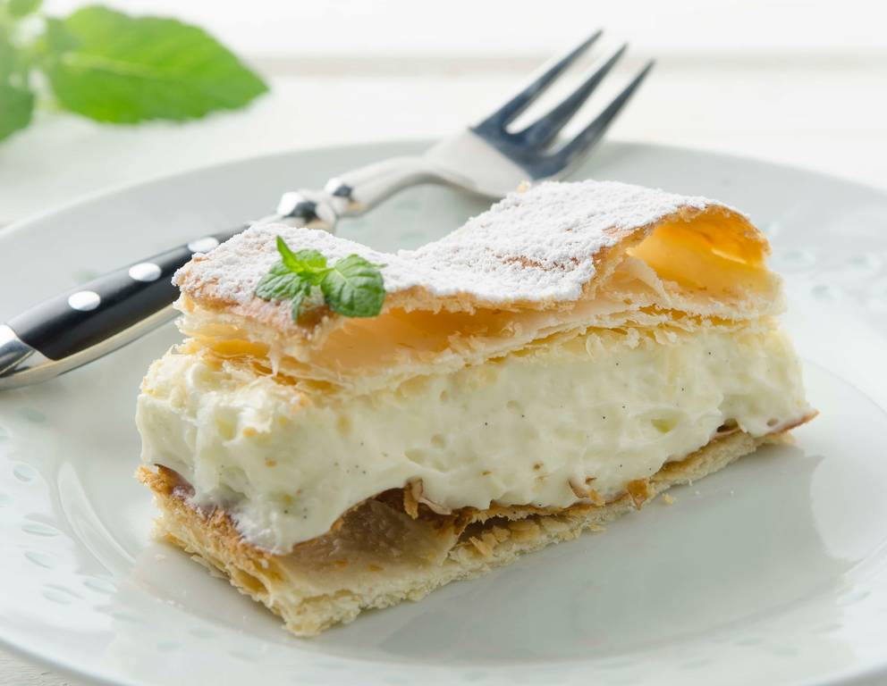 - Die kalte Creme auf dem gebackenen Blätterteig verteilen. Die zweite Bahn Blätterteig darauf legen und die Cremeschnitten mit Staubzucker bestreuen.