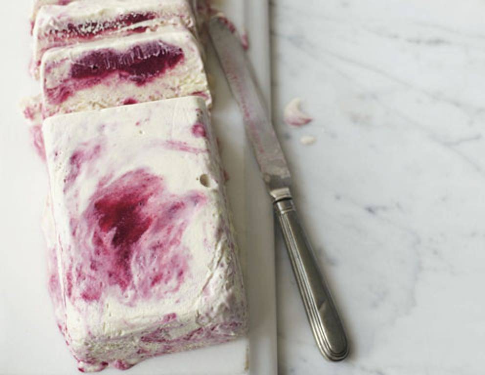 - Anschließend die Vanille-sahne unter die Zucker-Ei-Masse heben. Das Himbeerpüree so unter die Masse rühren, dass ein Marmormuster entsteht. Dann das Ganze vorsichtig in die vorbereitete Form geben. Die Oberfläche glatt streichen und mit der überstehenden Frischhaltefolie bedecken. 24 Stunden in den Gefrierschrank stellen.