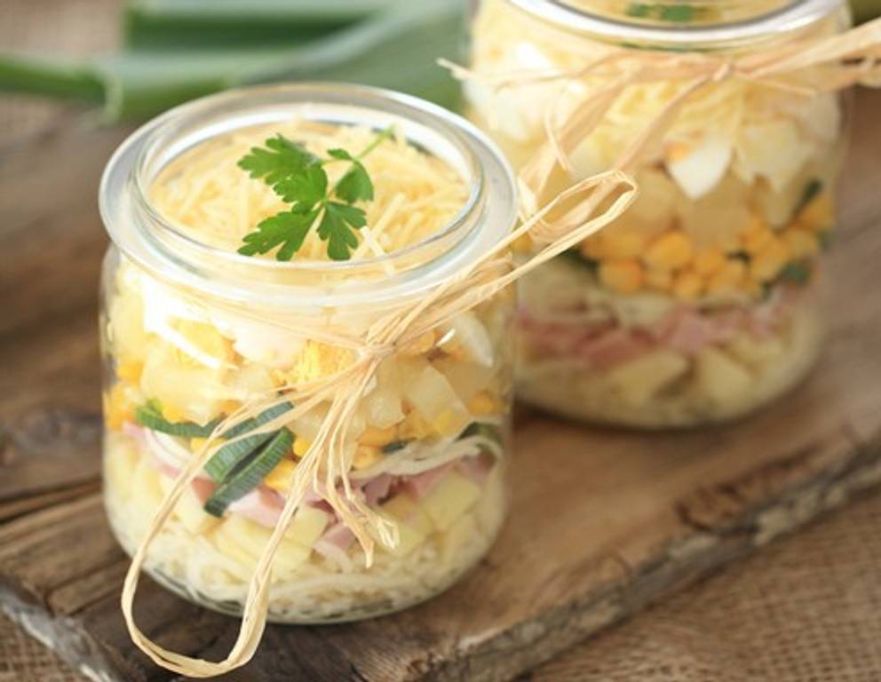 Am schönsten schaut ein Schichtsalat natürlich in einer Glasschüssel aus - so kommen die verschiedenfarbigen Zutaten besonders schön zur Geltung. Oder gleich in einzelnen Portionsgläsern serviert.