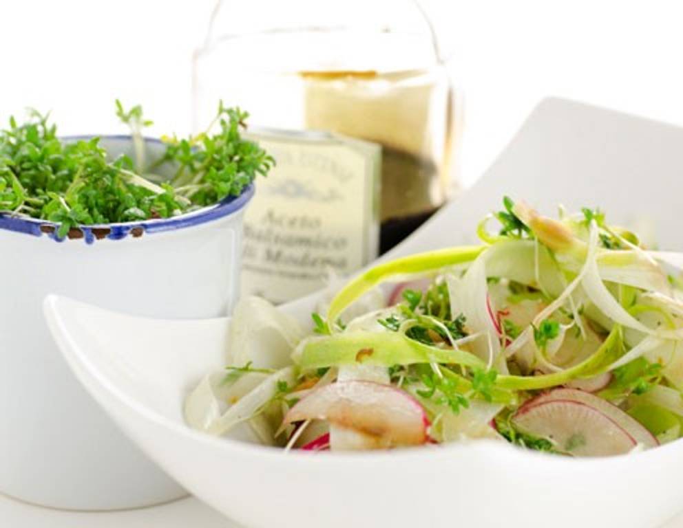 - Die Radieschen in Scheiben schneiden, mit der Kresse und den Pinienkernen in einer Schüssel mischen, den Balsamico Essig mit Honig und Olivenöl vermischen und mit Salz und Pfeffer abschmecken.