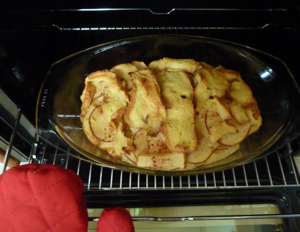 - Gratinform buttern und den Boden mit Brötchenscheiben ausbreiten, darauf eine Schicht Apfelscheiben Form, mit einigen Rosinen und einem Gemisch aus Zimt und Kristallzucker überstreuen, dann wiederholt eine Schicht Brötchenscheiben...fortfahren, bis alles zusammen aufgebraucht ist. Die oberste Schicht sollten Brötchenscheiben sein.
