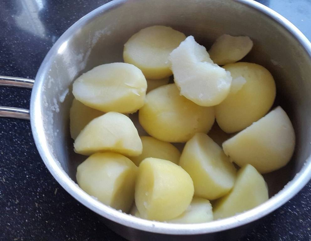 - Die Kartoffeln schälen und waschen. Die Kartoffeln in einen Kochtopf geben, mit Wasser bedecken und aufkochen.