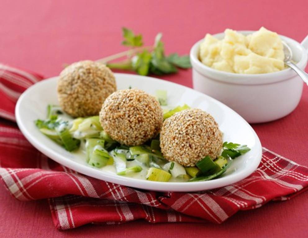 Als Beilage zu dem Sesam-Fleischbällchen Rezept empfehlen wir Kartoffelpüree und Lauchgemüse.