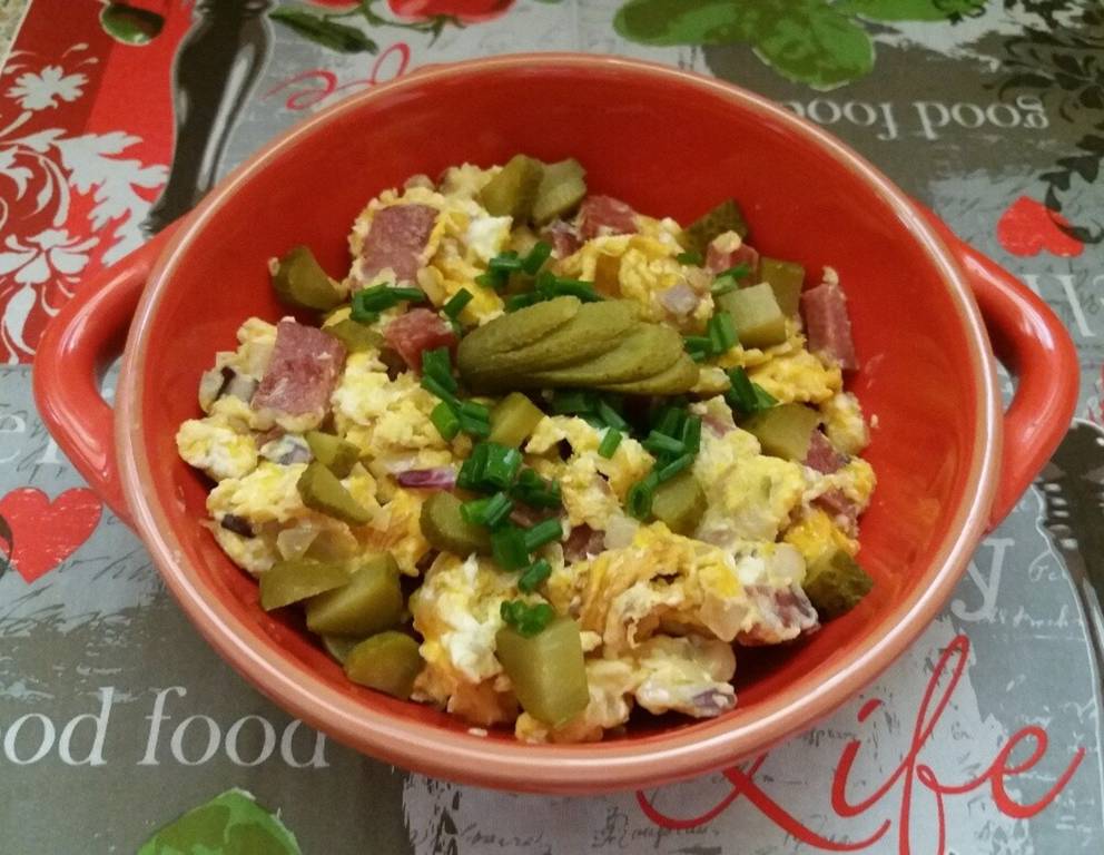 Die Restl Eierspeis mit frischem Schnittlauch, Petersilie oder anderen Kräutern nach Wahl verfeinern. Auch gehobelter Käse passt noch darüber. Die Restl Eierspeis kann ganz nach Vorhandensein der Zutaten und Geschmack variiert werden.