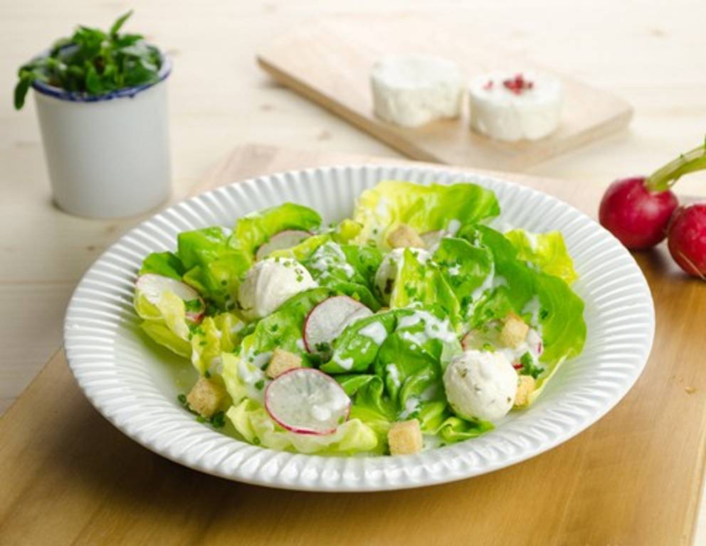 - Den Häuptelsalat waschen, die äußeren Blätter entfernen und auf einem Teller auffächern. Die Radieschen darauf verstreuen, großzügig mit dem Joghurt-Dressing besprenkeln und die Käsebällchen darauf verteilen.