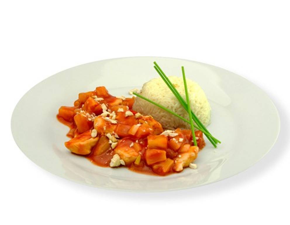 - Reis in einem tiefen Teller anrichten, Fleisch darauf platzieren, mit Cashewnüssen bestreuen und das Süß-Saure Huhn mit Cashewnüssen servieren.
