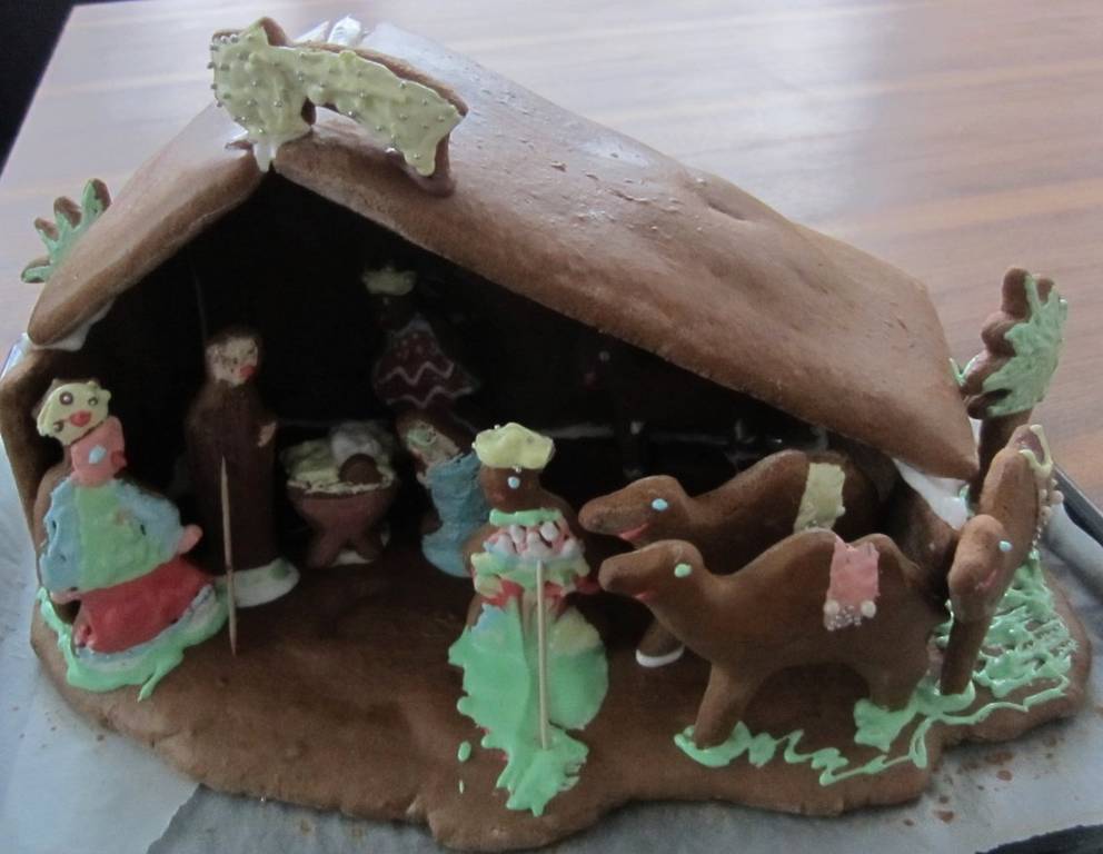- Am nächsten Tag die übrigen Zutaten einarbeiten. Den Teig fingerdick auswalken und die Teile für das Haus ausschneiden. Man lässt ihn bei mittlerer Temperatur, mehr trocknen als backen. Mit einer gesättigten Baisermasse (Eiklar/Staubzucker) wird das Lebkuchenhaus zusammengeklebt.
