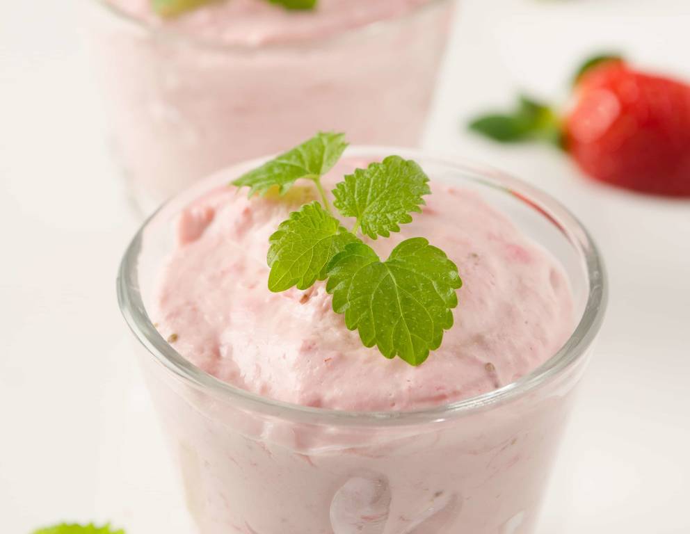- Die Erdbeermousse in Gläser füllen und mindestens 2 Stunden in den Kühlschrank stellen. Vor dem Servieren mit Zitronenmelisse garnieren.