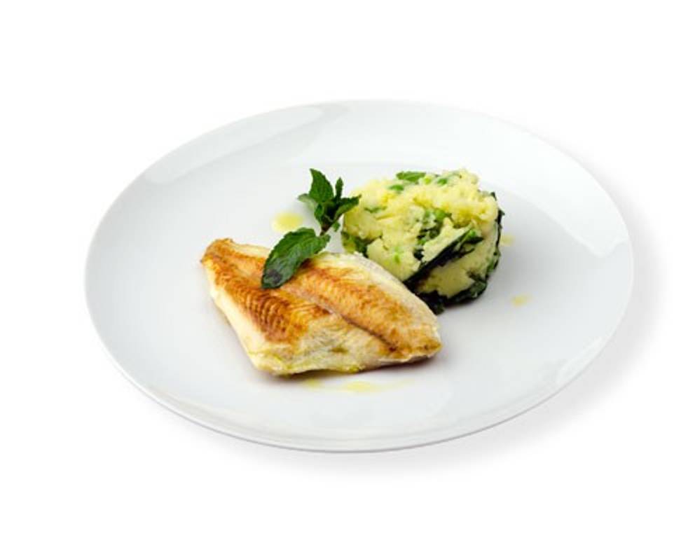 Das Rezept für gebratenes Schollenfilet auf gestampften Minze-Erdäpfel-Erbsen kann auch mit einem anderen Fisch zubereitet werden.