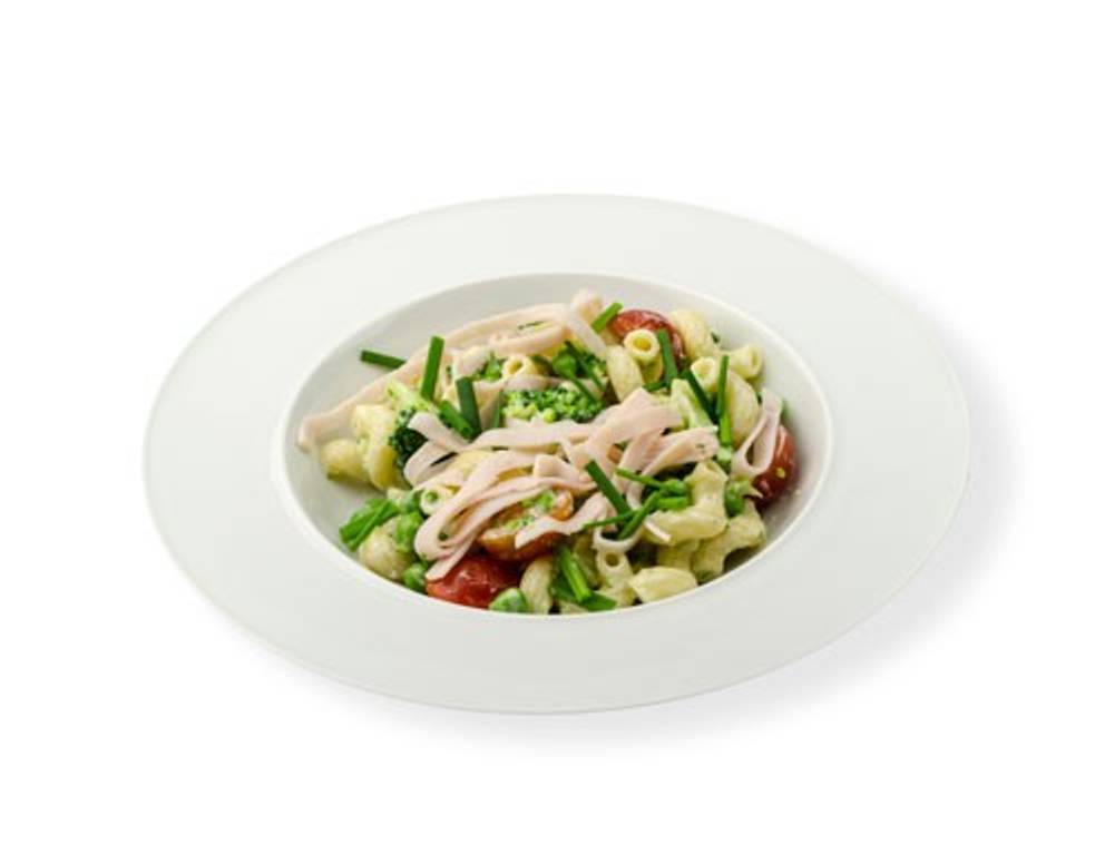- Das Joghurtdressing unter die Nudeln mischen und nochmals mit Salz und Pfeffer abschmecken. Den Putenschinken in feine Streifen schneiden und auf dem Salat verstreuen.