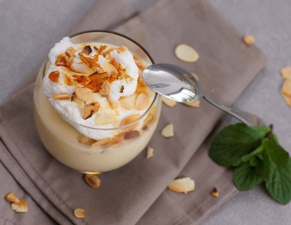 - Vor dem Servieren die Marillen-Topfen-Creme mit Schlagobers und kurz ohne Fett gerösteten Mandelblättchen garnieren.