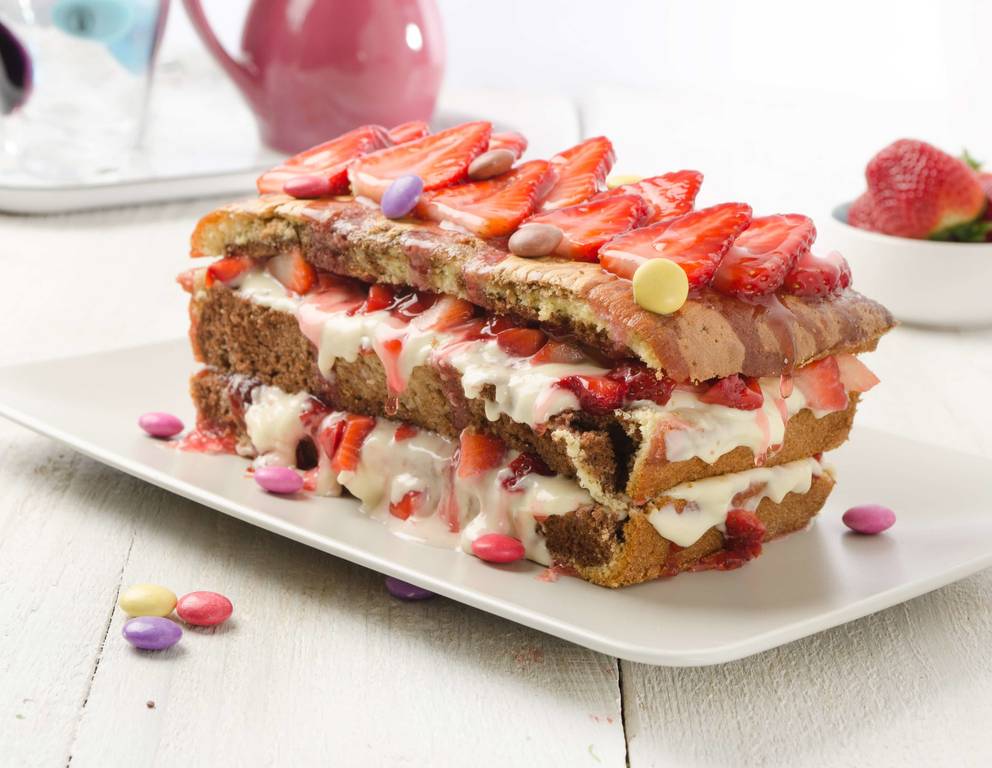 - Schneewittchenschnitte herausnehmen und mit in dünne Scheiben geschnittenen Erdbeeren belegen. Dick mit Tortengelee überziehen, dafür noch in der Springform lassen und nochmals kalt stellen. Dann die Schneewittchenschnitte mit Smarties, Schokobohnen, Gummibärlis sowie Schlagoberstupfern garnieren.