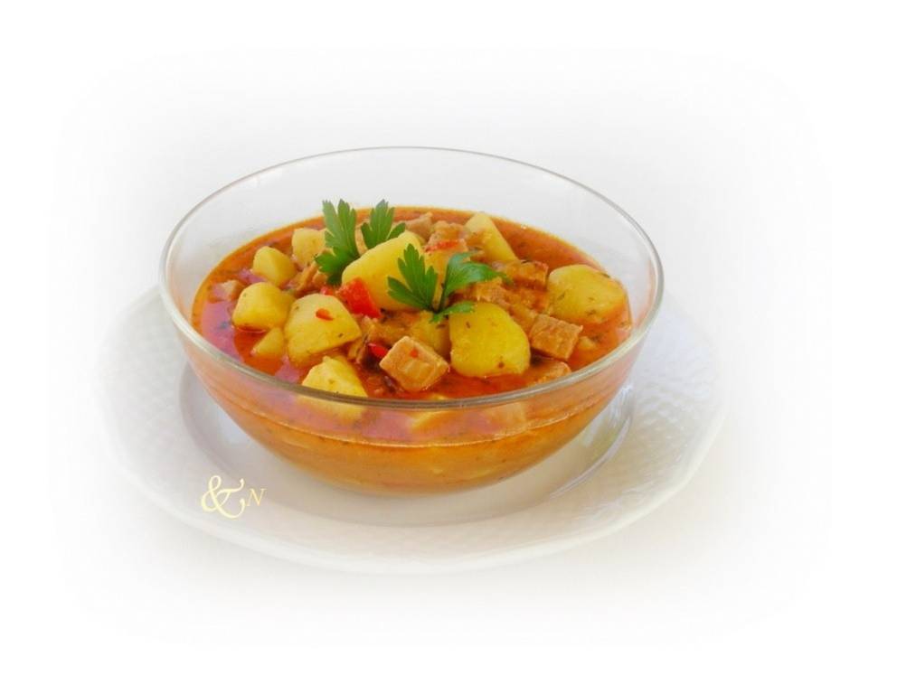 - Mehl darüberstreuen, alles zusammen ordentlich mischen. Mit der Suppe aufgießen und mit Pfeffer, Salz, Majoran, Kümmel, Paprikaschote und Zucker würzen. Alles ca. 40 Min. am Herd kochen.