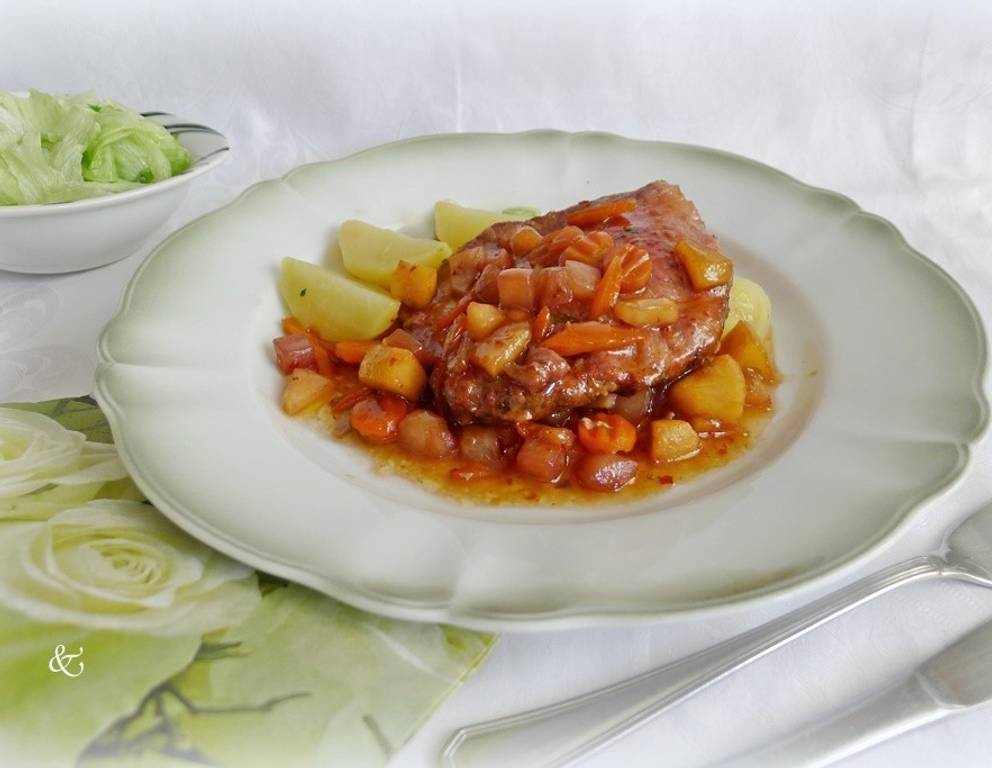 Schnitzel darin von beiden Seiten kurz anbraten. Mit Salz und Pfeffer würzen. In Alufolie wickeln und im temperierten Backrohr rasten lassen. Währenddessen das Wurzelgemüse in feine Streifen schneiden, die Schalotte fein hacken und beides im Bratrückstand anbraten. Honig einrühren und das Gemüse karamellisieren lassen. Rotwein zugießen und Wurzelwerk bissfest dünsten. Bei Bedarf etwas Wasser nachgießen. Zum Schluss Knoblauch fein schneiden und mit den gehackten Kräutern dazugeben. Durchschwenken und die Kalbsschnitzel darin noch kurz ziehen lassen.