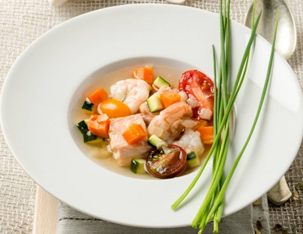- Mit Fischfond aufgießen, Fisch und Garnelen hinzufügen und so lange köcheln lassen bis Fisch und Gemüse gar sind. Fischsuppe mit Zitronensaft, Salz und Pfeffer abschmecken.