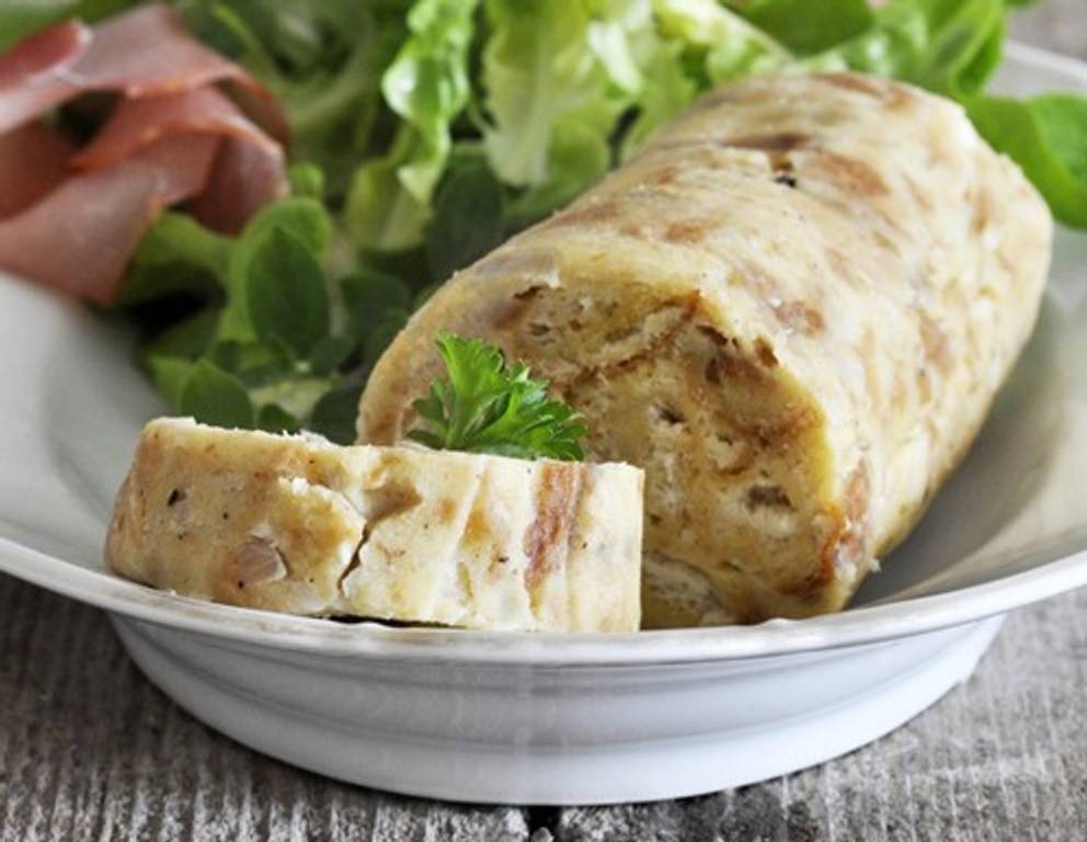 - Die Rolle in ein Küchentuch wickeln, an beiden Enden verschließen und in leicht siedendem Wasser für ca. 35 Minuten kochen.