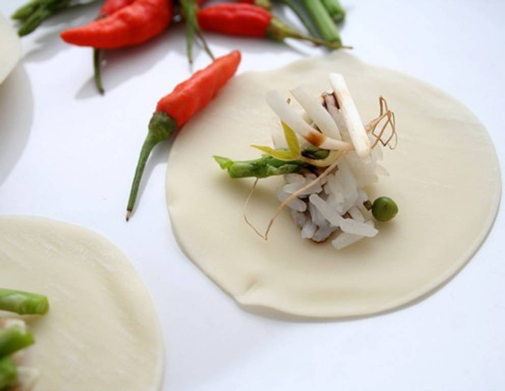 - Für den Wan-Tan-Teig das Weizenmehl mit den Eiern, Salz und einigen Tropfen Leitungswasser zu einem glatten Nudelteig zusammenkneten, 1/2 Stunde ruhen lassen.