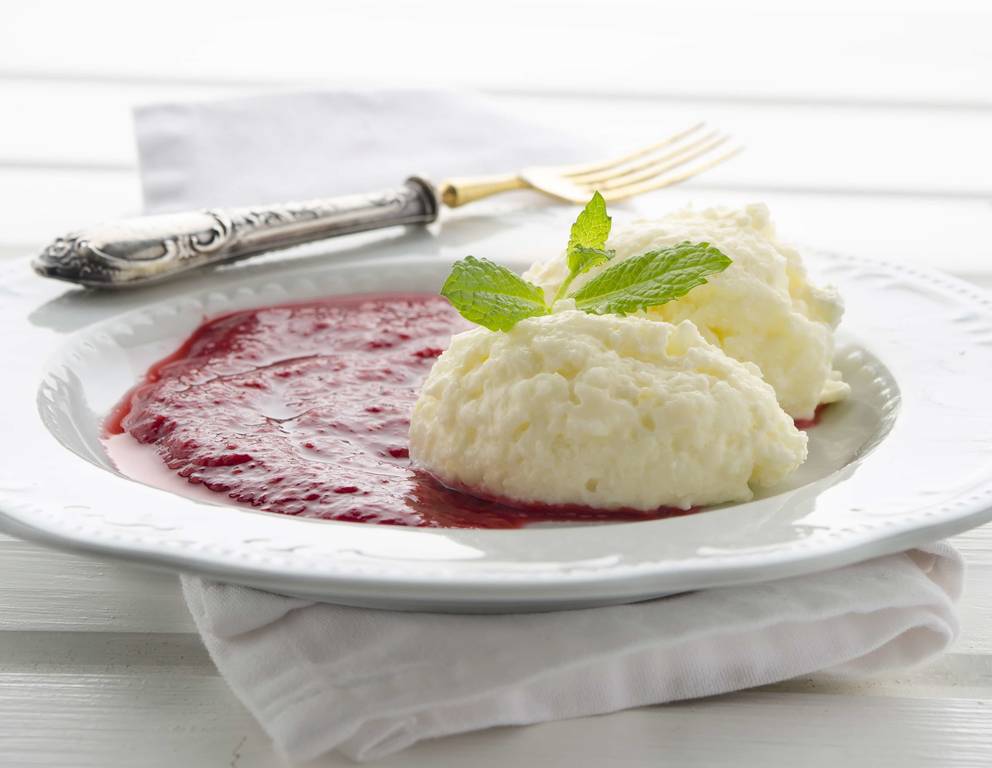 - Aus der Joghurtmasse Nockerln stechen und diese auf das Beerenpüree legen.