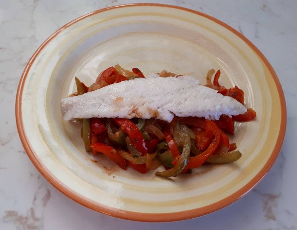 - Etwas Fischfond untergiessen, damit nichts ansetzt. Porree, Koriander und Pfefferkörner dito mitdünsten. Anschliessend den Fisch herausnehmen und warm stellen. Den Fond in einen kleinen Kochtopf passieren, übrigen Fischfond dazugeben und um die halbe Menge verkleinern. Salbei dazugeben und mit ein paar Butterflocken binden. Zander mit Letscho und Sosse anbieten.