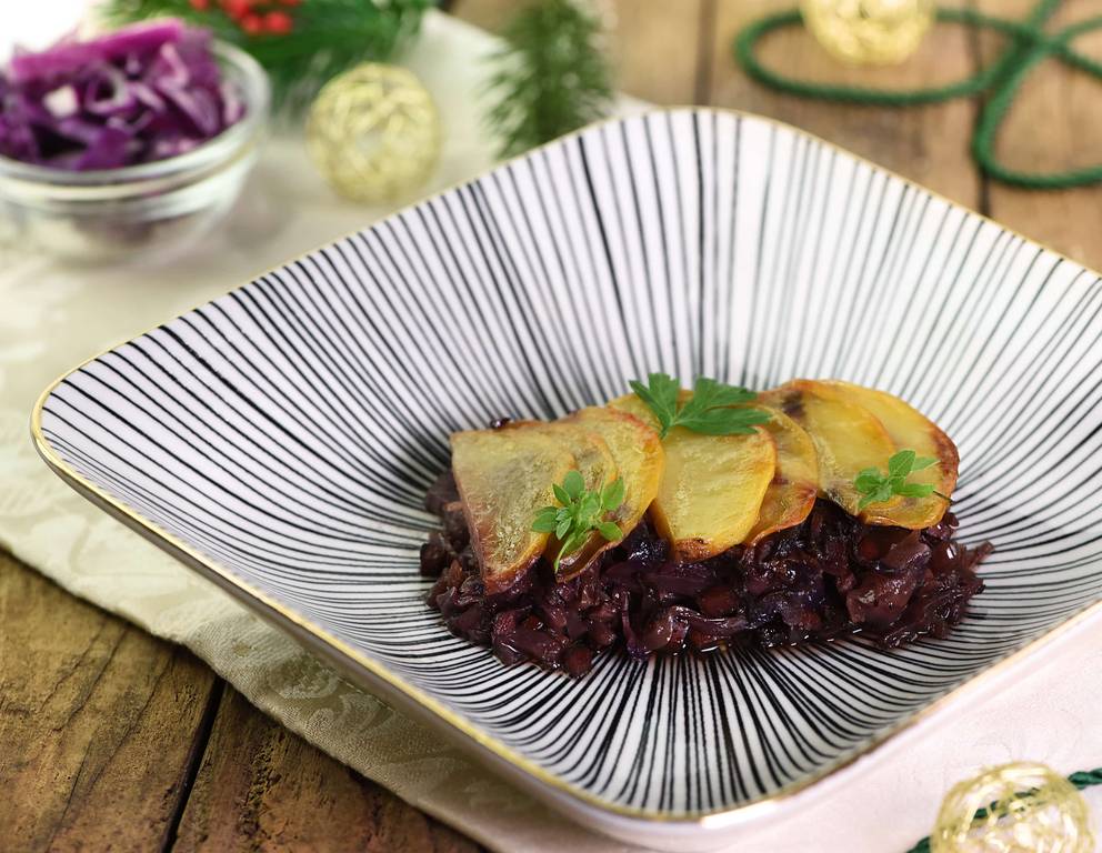 - Eine feuerfeste Form ausbuttern und das gekochte Rotkraut hineingeben. Die Erdäpfeln schälen und in dünne Scheiben schneiden. Das Rotkraut schuppenartig damit belegen.