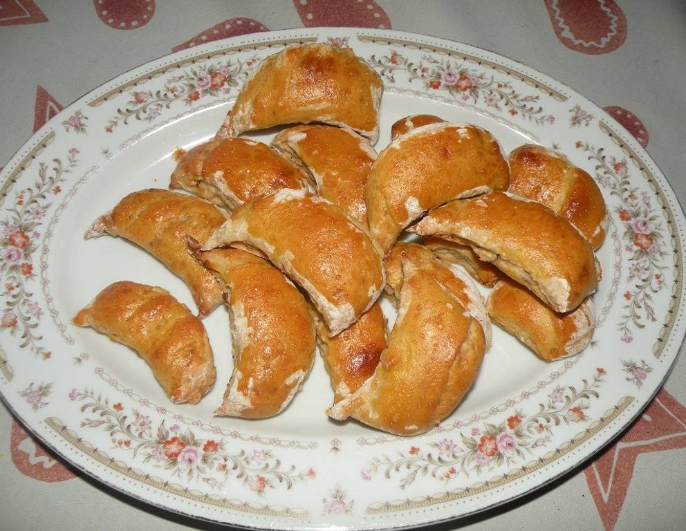 - Teig in Längsrichtung einrollen. Mit einem runden Keksausstecher (oder Trinkglas - 5 cm ø) kipferlfoermige Teigstreifen abstechen. Mit Ei bestreichen und auf ein mit Backtrennpapier ausgelegtes Backbleck setzen. Auf mittlerer Schiene bei 170 °C etwa 150 min backen. Die Hörnchen sind abgekühlt und trocken gelagert in etwa 2 Wochen haltbar.