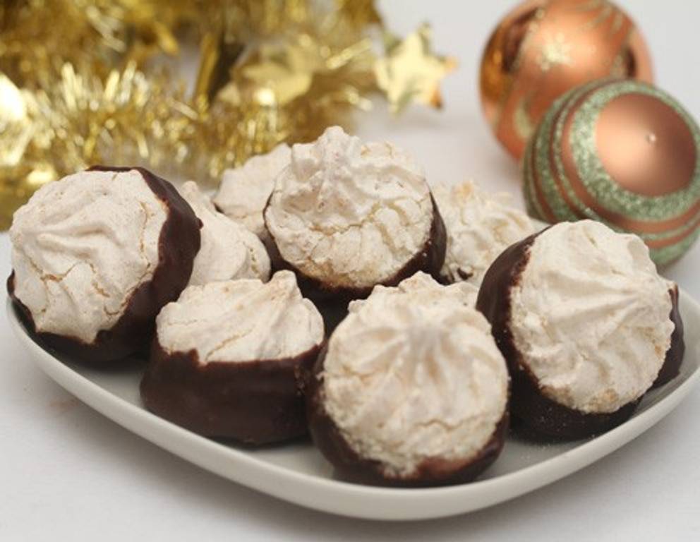 - Den unteren Rand der Kokoskuppeln in Schokoladeglasur tauchen.