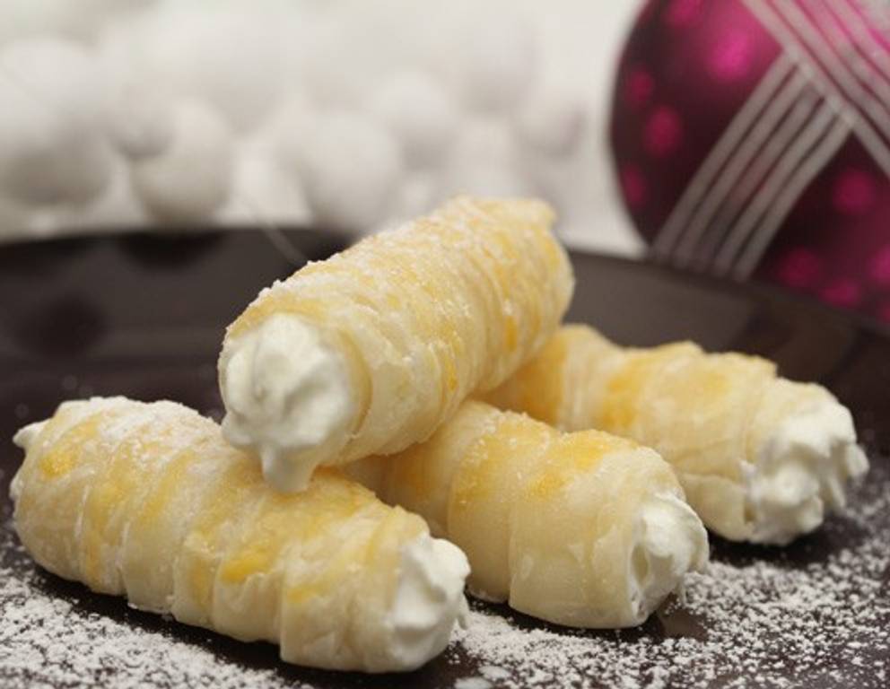 - Die Schneemasse in einen Spritzsack mit sternförmigem Aufsatz geben und damit die Blätterteigrollen füllen.