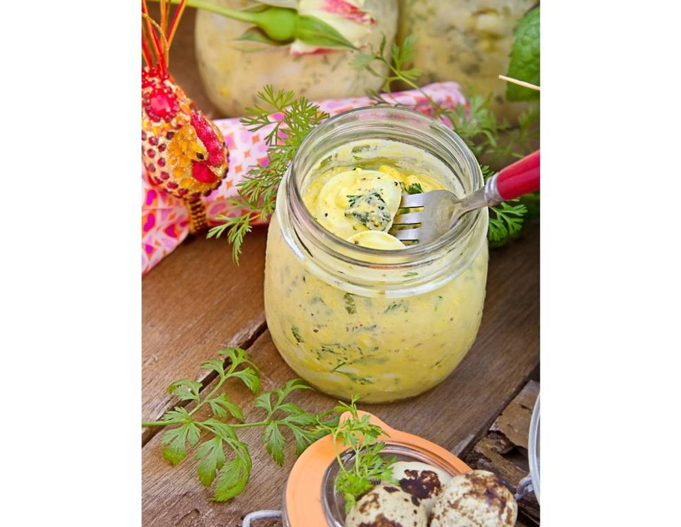 - Den Eiersalat in dekorativen Schalen anrichten und mit den halbierten Wachteleiern obenauf dekorieren. Mit Kräuterzweigen garnieren.