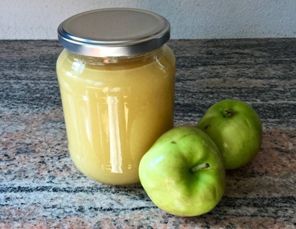 - Die Äpfel werden gewaschen, von Blüten und Stielen befreit, in 4 bis 6 Teile geschnitten und mit Wasser und Zitronenschale vorsichtig weich gekocht, durch ein Sieb gerührt und mit dem Zucker zu einem dicken Brei gekocht.