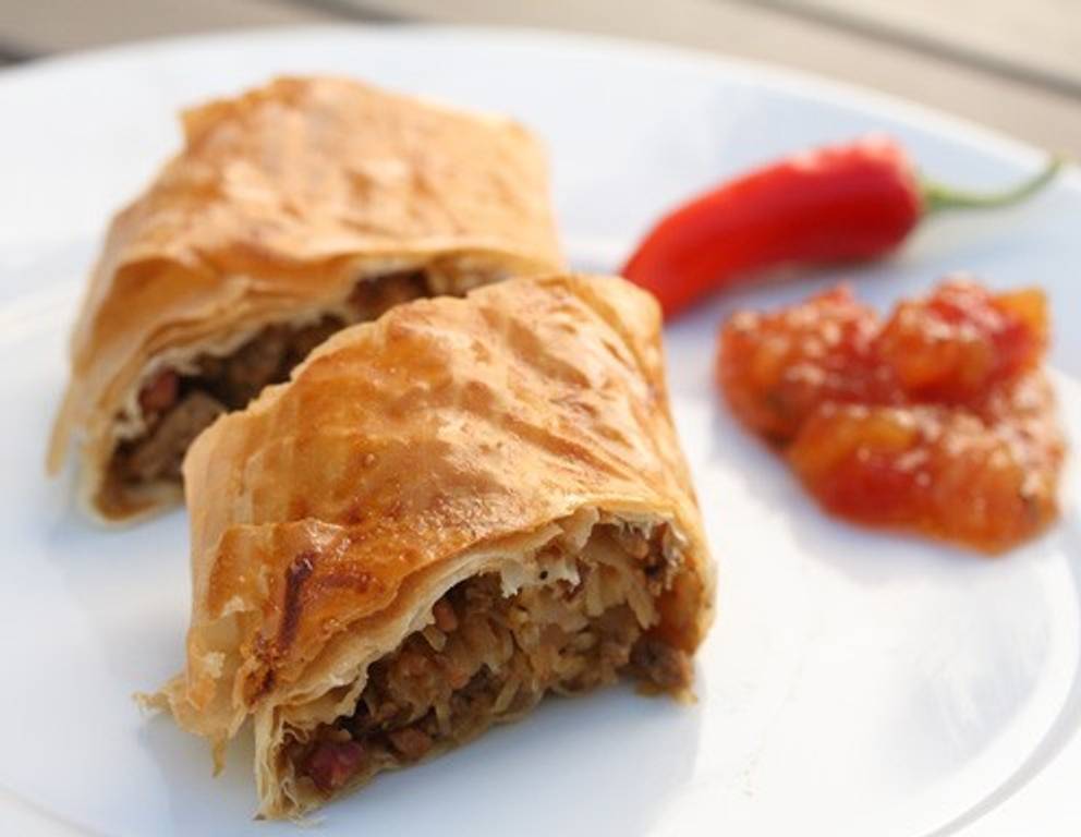 - Scharfer Krautstrudel kann z.B. mit würzigem Tomatenchutney serviert werden.