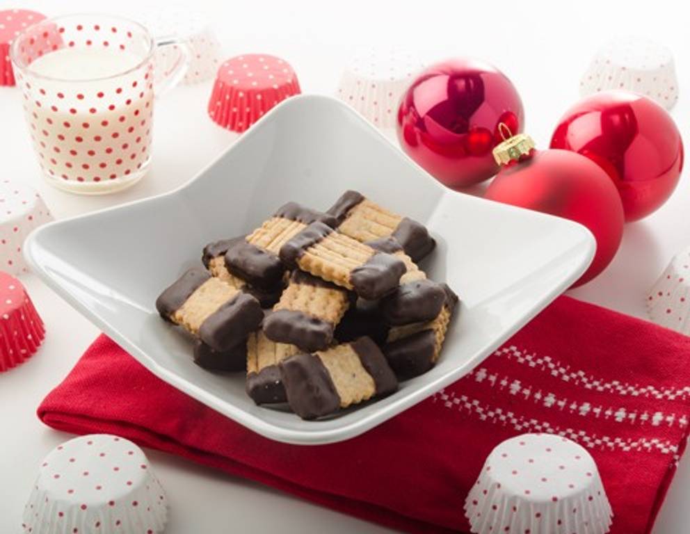 - Jeweils zwei Kekse mit Marmelade zusammenkleben. Die Stangenenden in Schokoladeglasur tauchen und die Mürbteig-Nuss-Stangerln trocknen lassen.