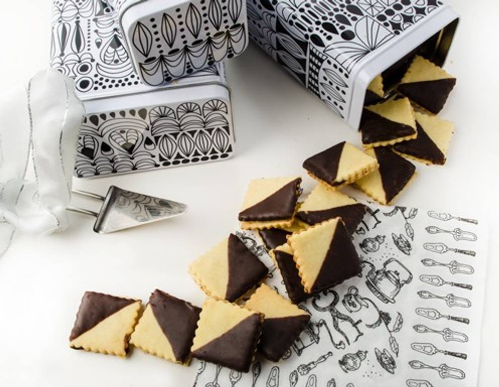 - Die Kekse mit einer diagonalen Hälfte in die Schokoglasur tauchen und auf ein Gitter setzen. Trocknen lassen.